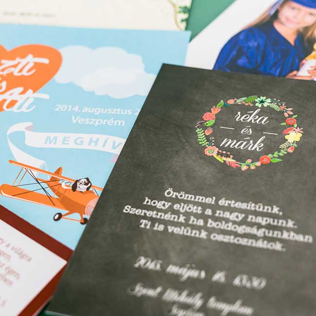 A meghívók különösen nagy szerepet töltenek be magánrendezvények. A termék számtalan minőségű papírra készülhet, teljesen egyedi méretben, gyors kivitelezéssel.